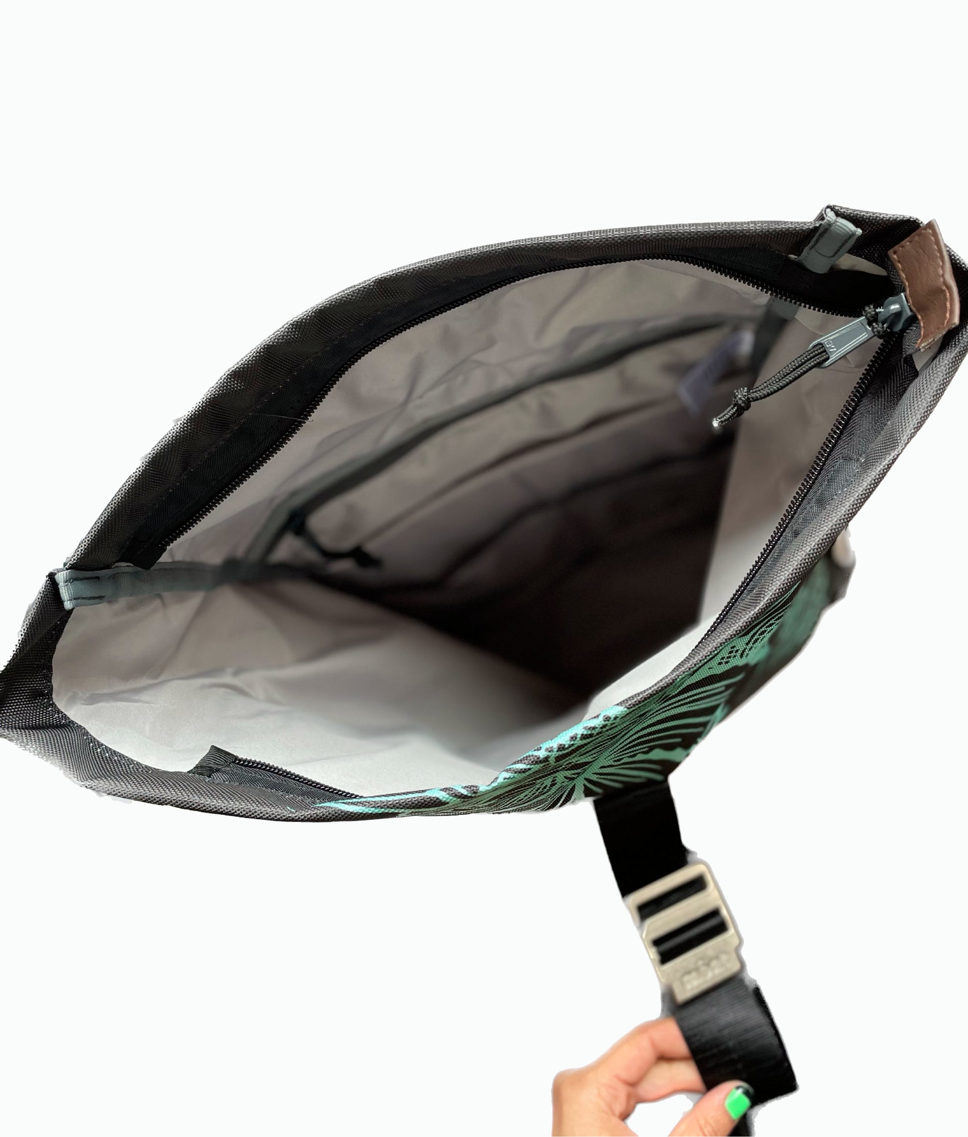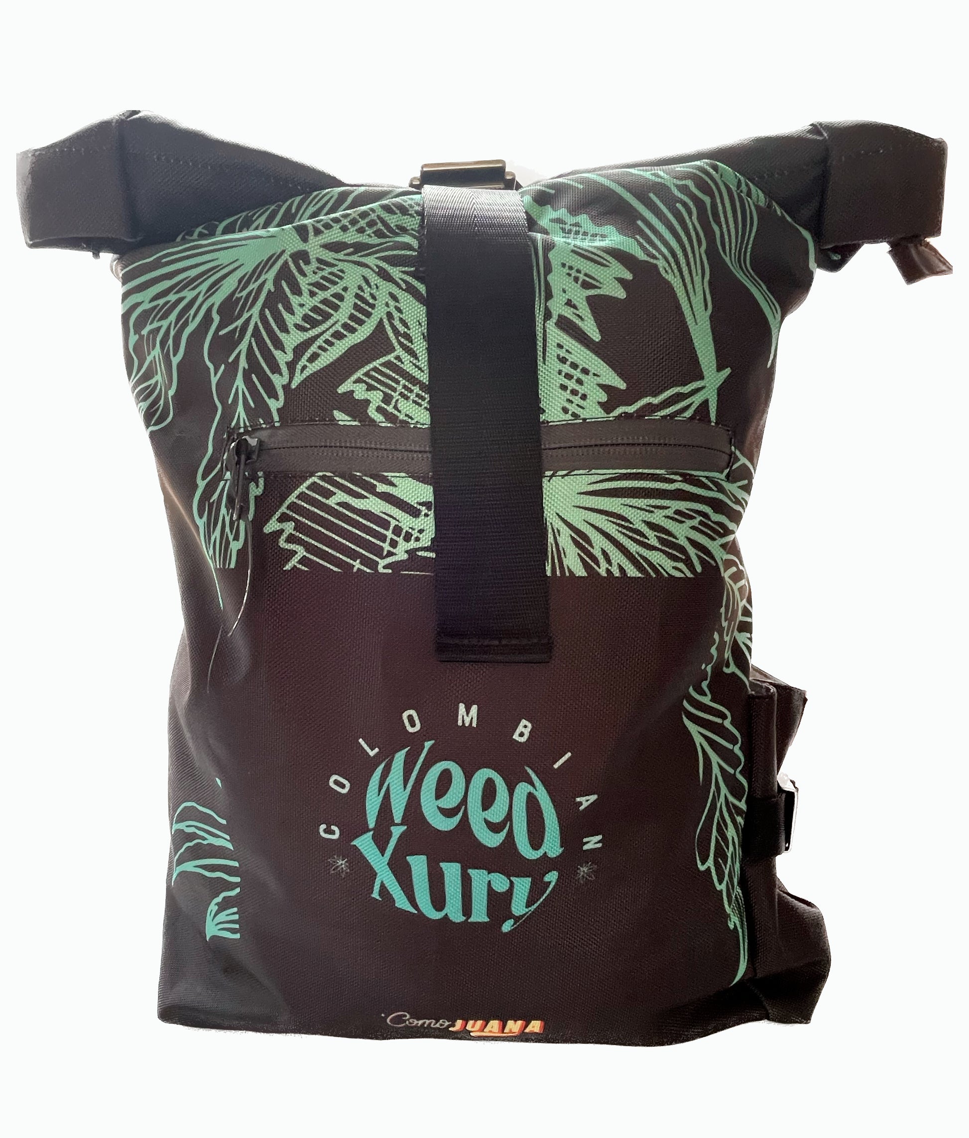 Morral negro diseño Como Juana, Colombian Weedxury con sistema de cierre enrollable que te permite comprimir o expandir la capacidad, ideal para la llevar pocas cosas en ciudad o para llevar de todo en tus viajes. Porta-Pc de hasta 17″.