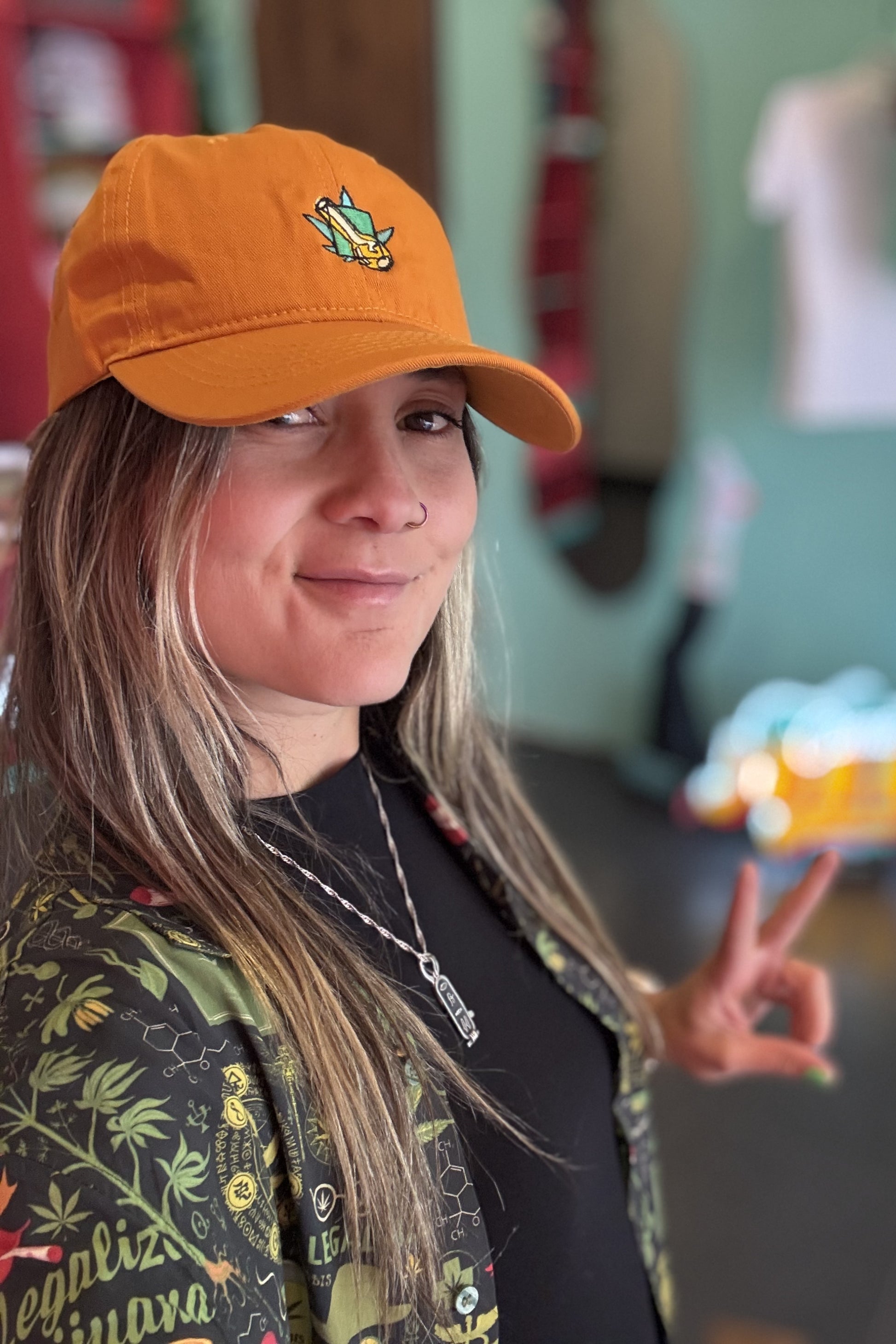 Nuestra nueva colección: El Jardín de Como Juana, trae gorras beisboleras bordadas con diseños únicos creados para ella. Esta gorra mostaza unisex bordada con visera curva, de algodón con estructura de tapas, textura acanalada y correa para ajustar en la parte trasera. Su bordado delantero tiene nuestro CannaBong, también conocido como pipa de agua, dispositivo de filtración para enfríar el humo antes de que llegue a los pulmones.