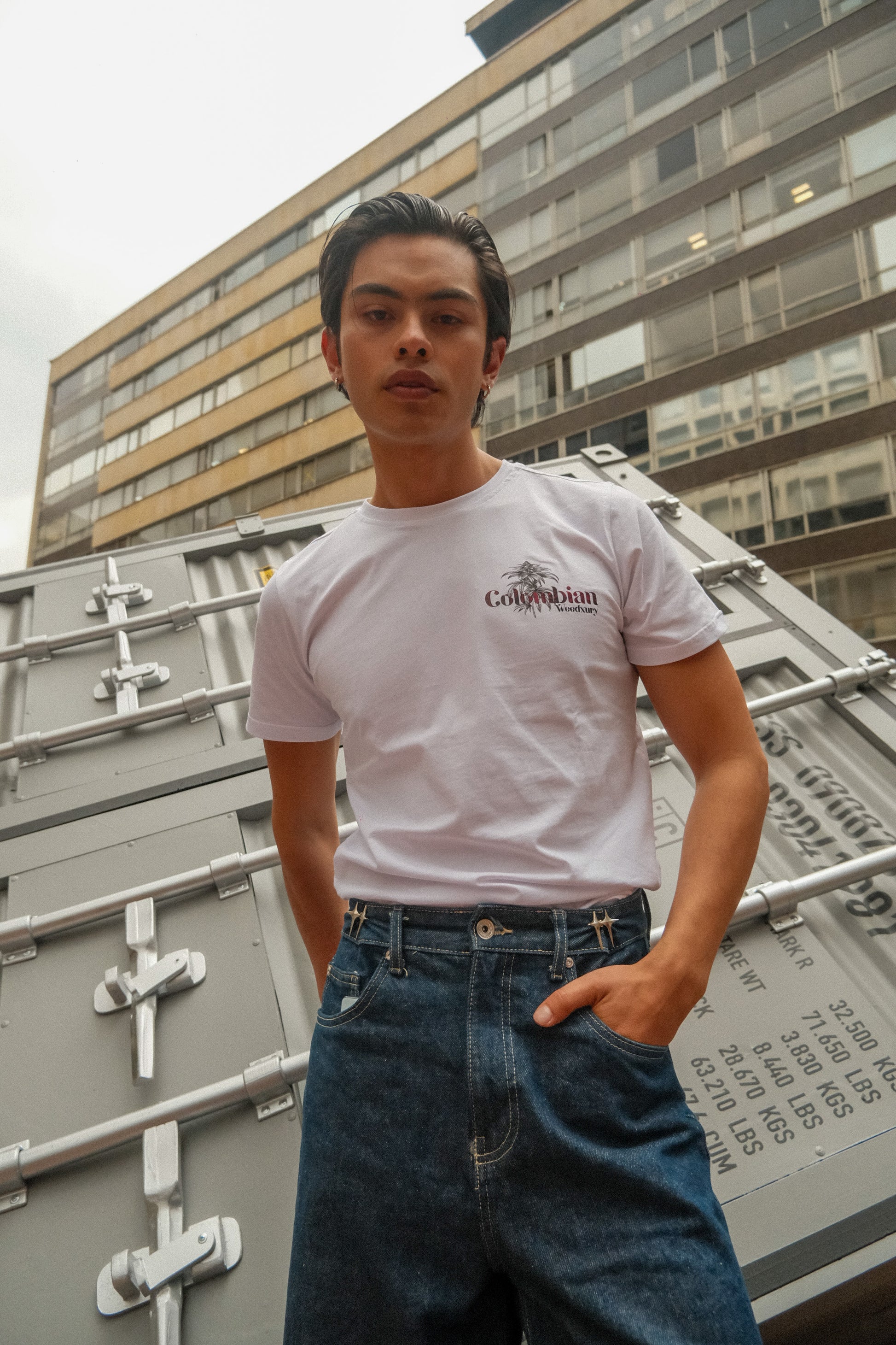 Camiseta blanca cuello redondo en algodón 100% estampada con un diseño de Como Juana con sublimación de la planta en la espalda y logo de Como Juana en la parte superior y estampado Colombian Weedxury en la parte de adelante.
