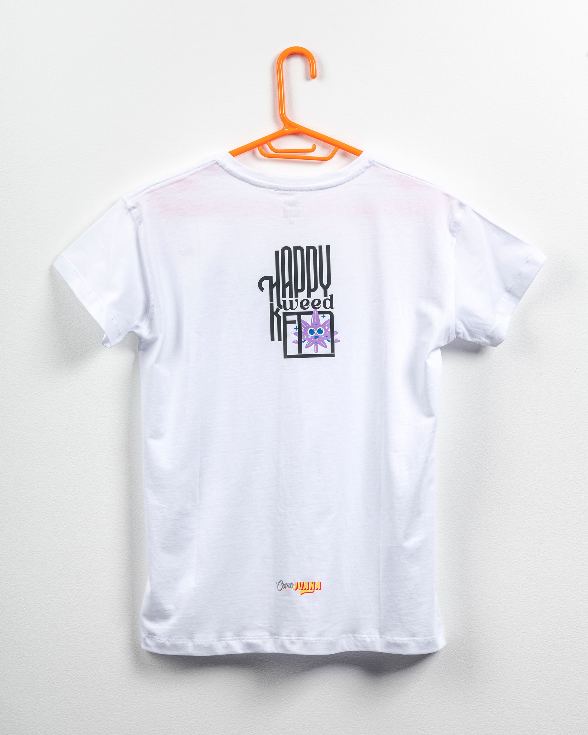 Camiseta blanca cuello redondo en algodón 100% estampada con un diseño de Como Juana en espalda superior de Happy Weedkend e inferior con logo de Como Juana. Adelante iniciales de la marca.