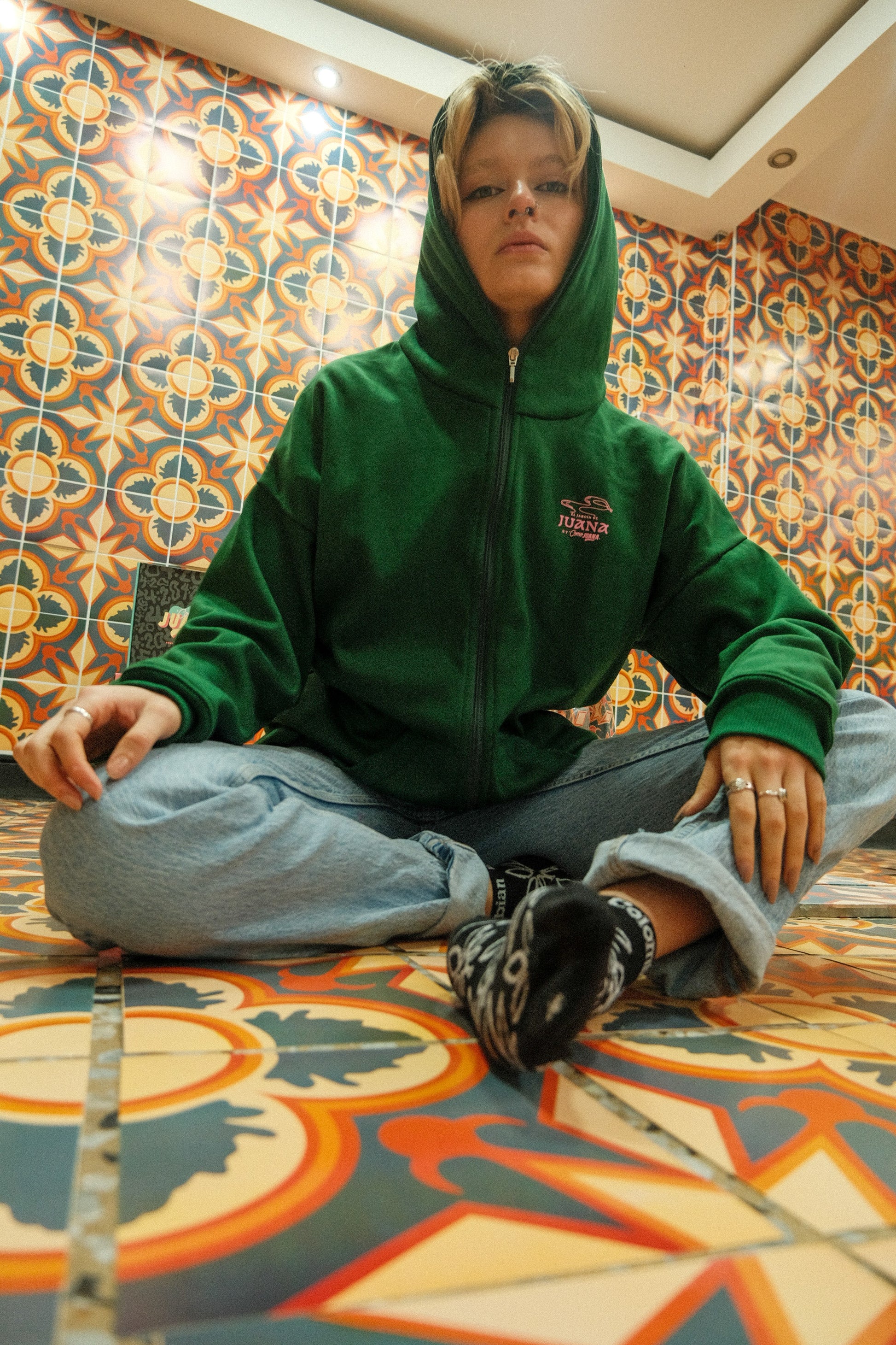 Hoodie con cremallera hasta la capota (FullZip) color verde, confeccionado en mezcla premium de algodón y poliéster (280 g/m²). Es la pieza que se convierte en tu refugio dentro del paraíso: suave, duradero y con un fit que te acompaña en cualquier vibra.